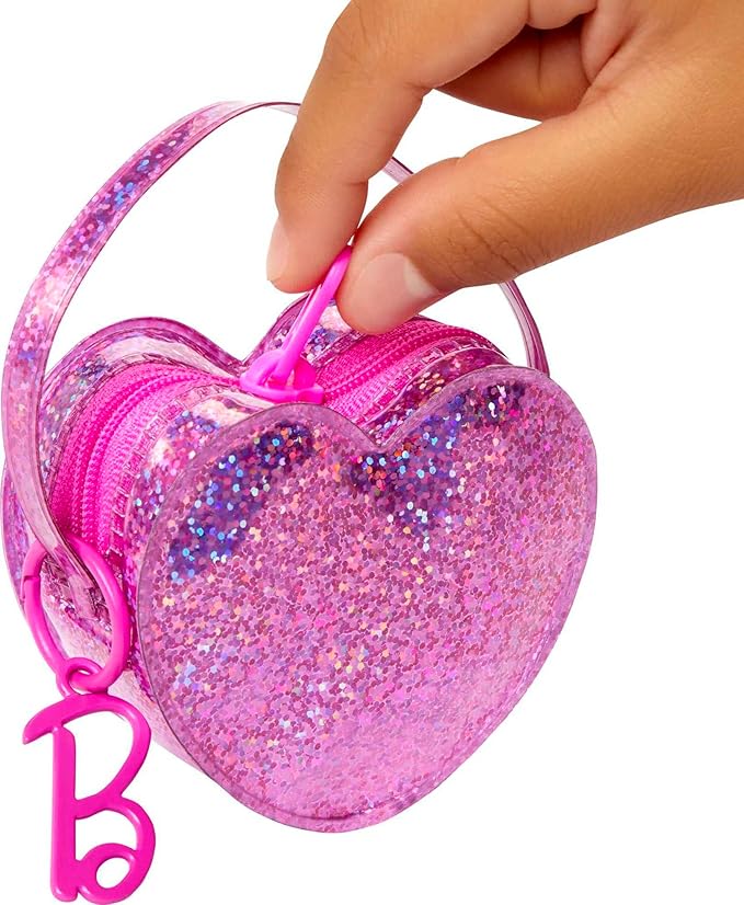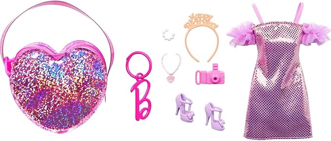 Barbie Clothes Set, Birthday-Themed with Dress, 5 Acessories & Zippered Doll-Sized Heart-Shaped Bag with Clip-On Ring