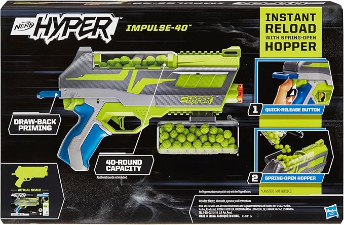 NERF Hyper Impulse-40 Blaster, 30 Nerf Hyper Rounds, Spring-Open Instant Reload Hopper, Up to 110 FPS Velocity, Eyewear Included