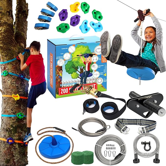 Zip Line Kit for Kids and Adults, 100/120/150/200 ft, Up to 350 Lbs, Removable Trolley, Rustproof Stainless Steel, Quick Setup with Ratchet, Safety Harness, Backyard Adventure Fun W/Climbing Holds