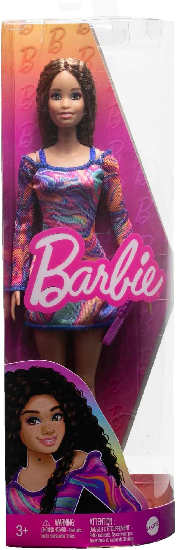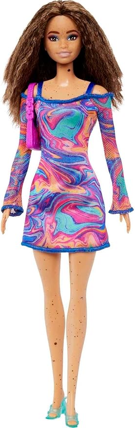 Barbie Fashionistas Doll #206 with Crimped Hair & Freckles Wearing Removable Rainbow Marble-Print Dress, Green Mules & Purse