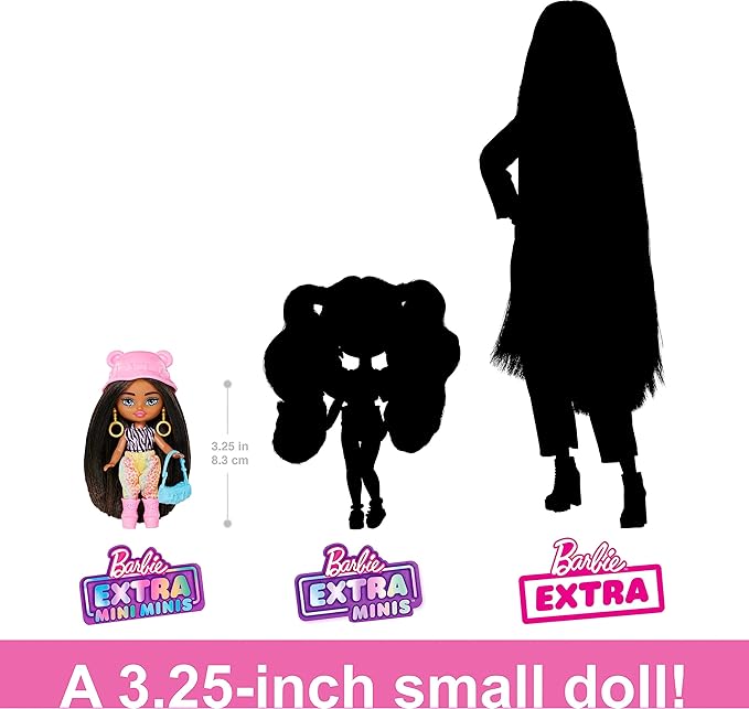 Barbie Extra Mini Minis Travel Doll with Brunette Hair, Zebra-Print Hoodie, Leopard-Print Joggers & Safari Accessories, 3.25-inch