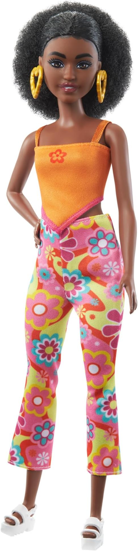 Barbie Fashionistas Doll #198, Petite with Curly Black Hair, Retro Floral Clothes & Accessories Including Platform Sandals & Earrings