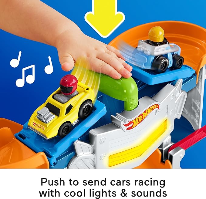 Fisher-Price Little People Hot Wheels Toddler Toy Race and Go Track Set with Lights Sounds & 2 Cars for Pretend Play Kids Ages 18+ Months