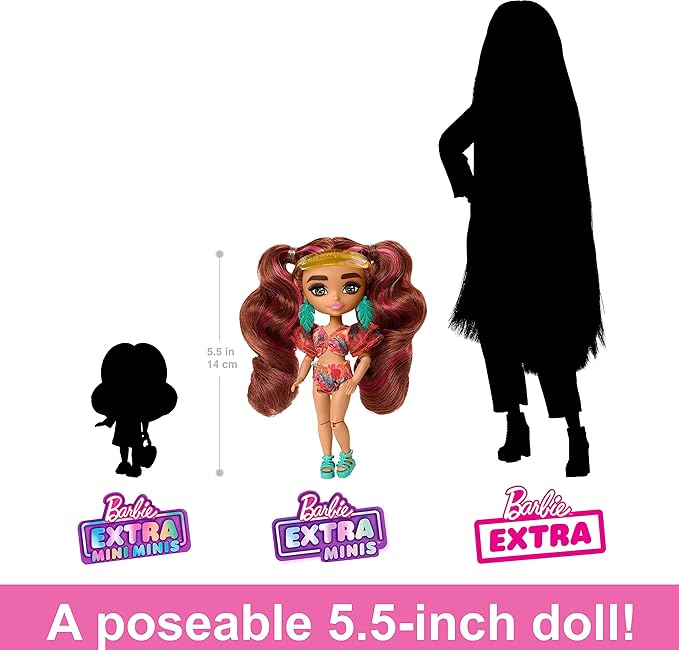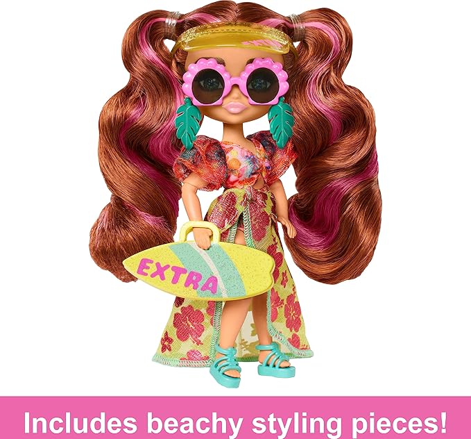 Barbie Extra Fly Minis Travel Doll, Beach Look with Pink-Streaked Pigtails in Swimsuit, Sarong & Accessories
