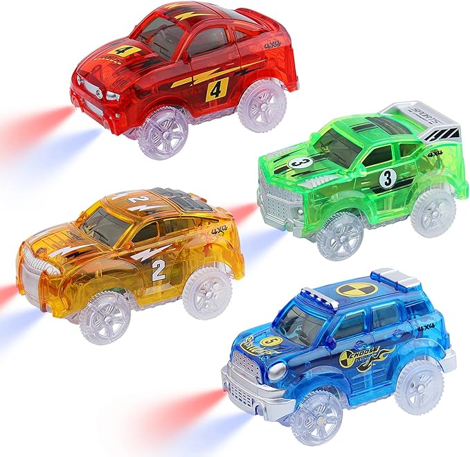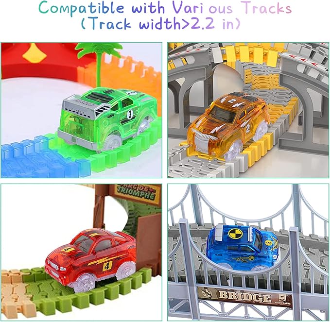 Track Cars Magic Toy Gifts 4 Pack Replacement Track Cars for 3 4 5 6 7 8 Years Old Kids Boys Girls Toy Track Cars with 5 LED Lights Glow in The Dark Compatible with Most Tracks