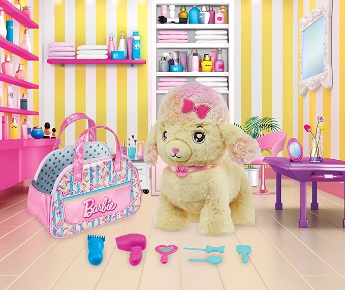Mattel Barbie Plush Toy Playset, Hairdresser Poodle Stuffed Animal with Lights & Sounds, Plus Themed Purse & 6 Accessories, Salon Pet Adventure