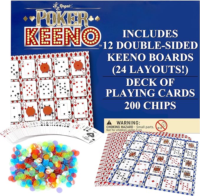 Regal Games - Poker Keeno Bulk Game Set - Includes 12 Two-Sided Boards, 200 Scoring Chips, 1 Deck of Standard Poker Cards - 24 Unique Board Layouts- Casino Night Card Game- Compatible with Poker Keno