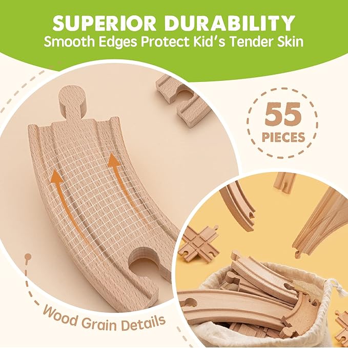 Tiny Land 55PCS Wooden Train Set - Compatible with Major Brand Tracks, Educational Toy for Toddlers & Kids Ages 3-7, Durable Wooden Railway Tracks