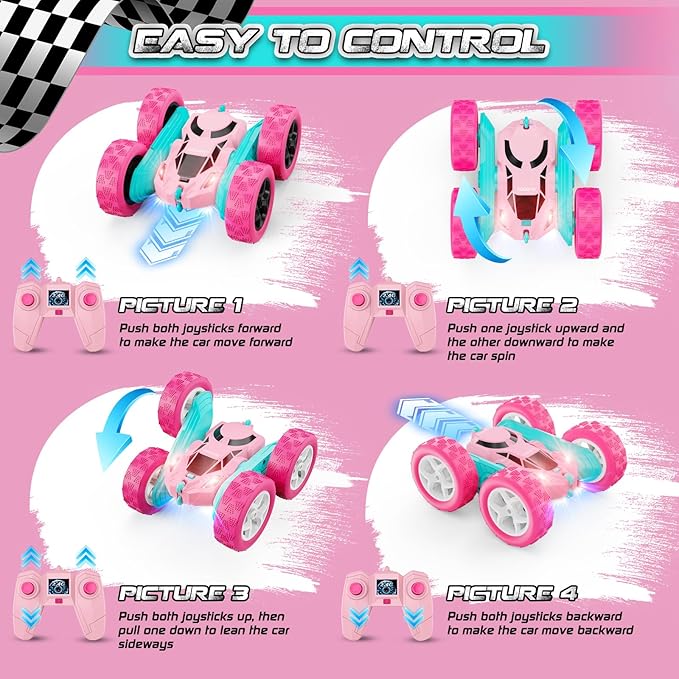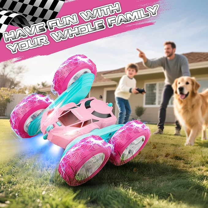 Pink Remote Control Car for Girls - RC Stunt Cars with 4WD Double-Sided Driving 360° Flips Rotating, Off Road Remote Car Outdoor Toys for Kids Age 6 7 8-12, Christmas Birthday Gifts