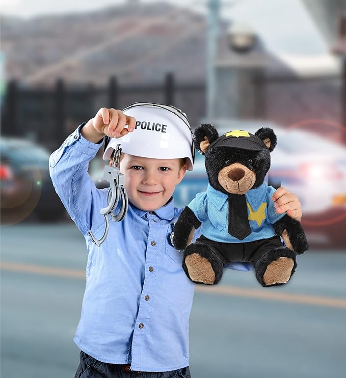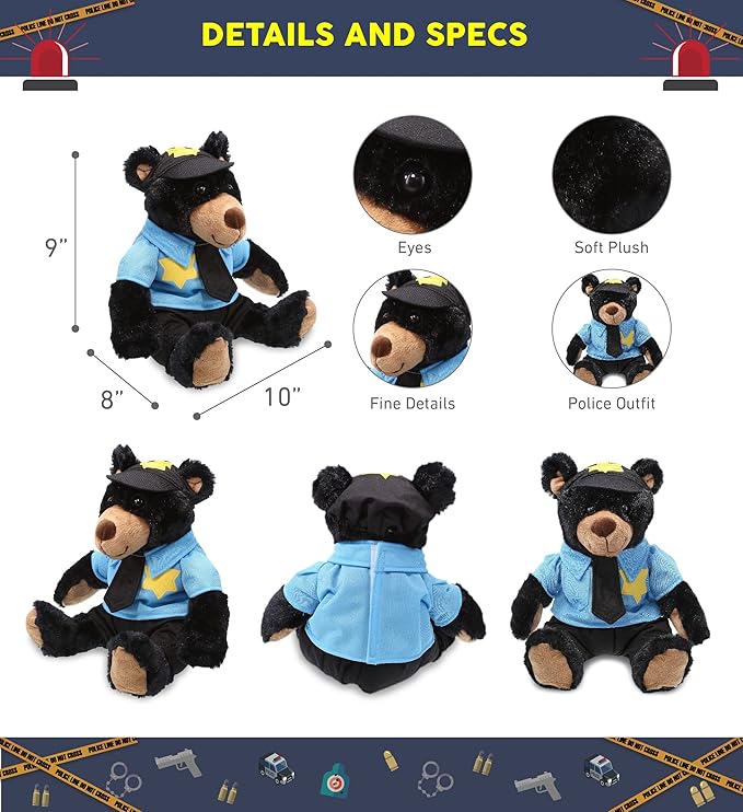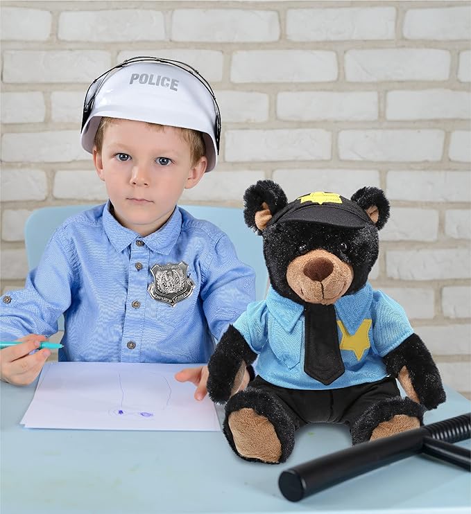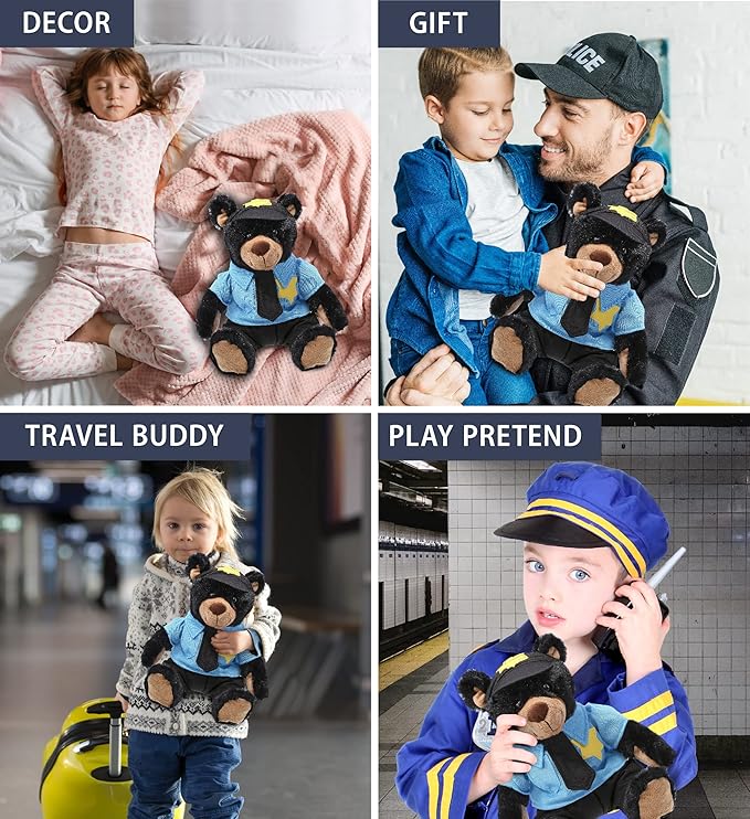 DolliBu Black Bear Police Officer Plush Toy - Super Soft Plush with Red Plaid Hoodie Stuffed Animal with Cute Cop Uniform and Cap Outfit - Gift with Personalization - 10 Inches
