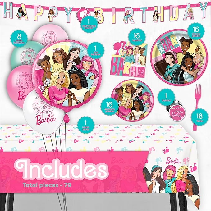 Barbie Birthday Party Decorations | Barbie Party Decorations | Serves 16 Guests | Balloons, Banner, Tablecover, Plates, Napkins, Button | Officially Licensed