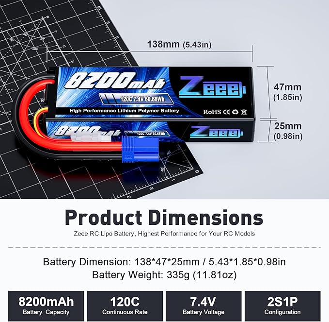 About This 【Zeee 2S 8200mAh RC Lipos Specification】- Battery Voltage: 7.4V; Cell voltage: 3.2~4.2V; Capacity: 8200mAh; Discharge: 120C; Connector type:... Read more