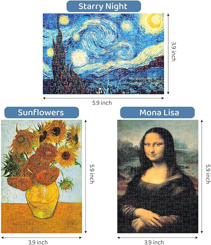 About This ✨PACKAGE INCLUDE: 3 PACKS mini jigsaw puzzles (starry night, mona lisa,sunflower), 1 pack contains 150 PIECES. FINISHED SIZE:... Read more