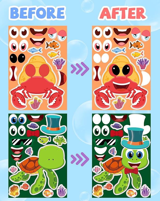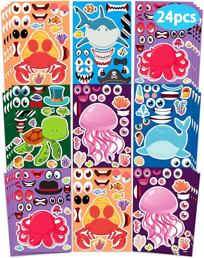 24 Pcs Make Your Own Sea Animal Sticker Sheets for Kids with Animal Party Favors Face Stickers for Toddlers Crafts Activities Gift Bags Birthday Party Favors for Kids