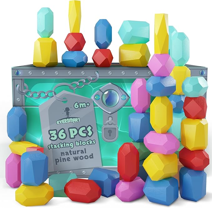 Wooden Stacking Blocks โ Montessori Toys for 1 2 3 4 5 6 Year Old Toddlers and Kids, No Choking Hazard โ Building Rocks Stones Games, for Girls and Boys