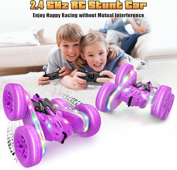 Remote Control Cars for Girls, 2.4GHz RC Stunt Car with 360° Flips & Double Sided Driving, LED Strip Lights and Headlights, Changeable Wheels, Birthday Gift for 5-12 Year Old Girls (Purple)