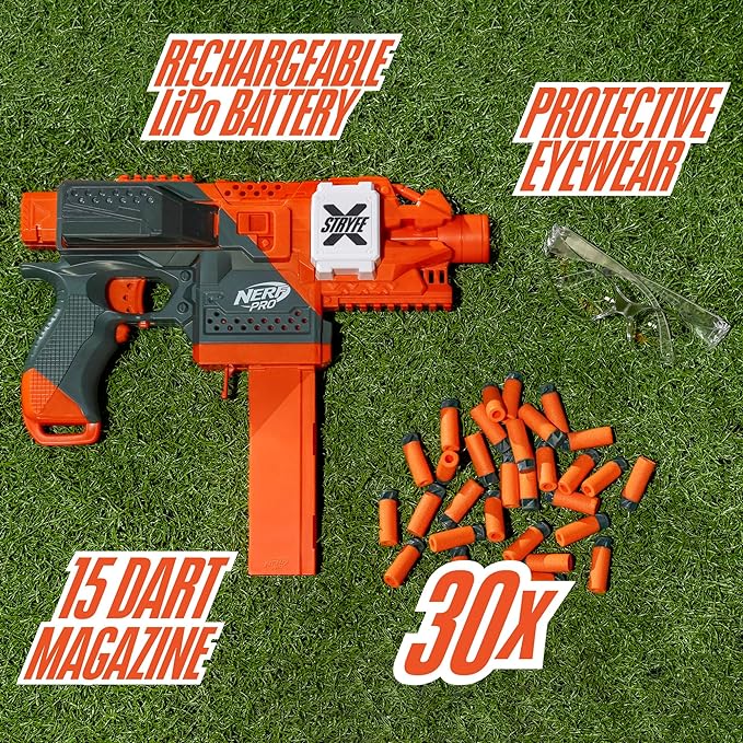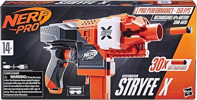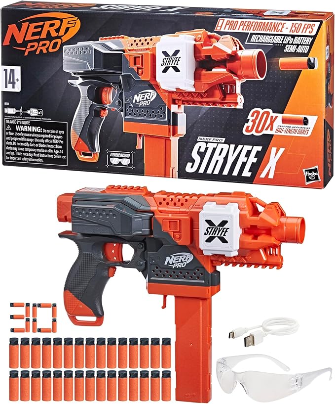 NERF Pro Stryfe X Dart Semi-Auto Blaster, Rechargeable LiPo Battery, 30 AccuStrike Half-Length Darts, 15-Dart Magazine, 150 FPS, Eyewear, 14+ (Amazon Exclusive)