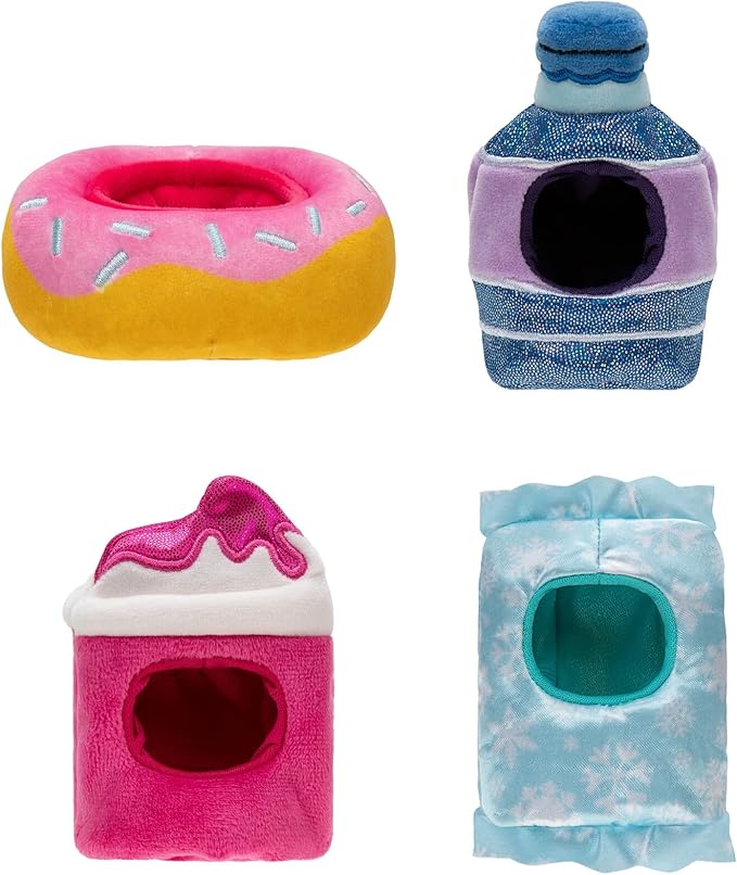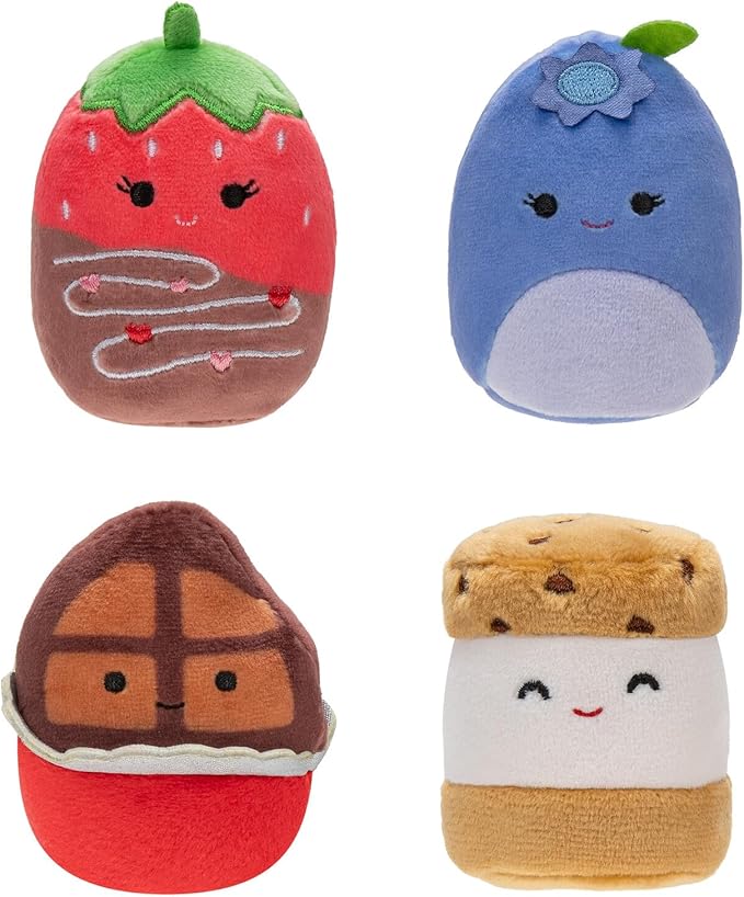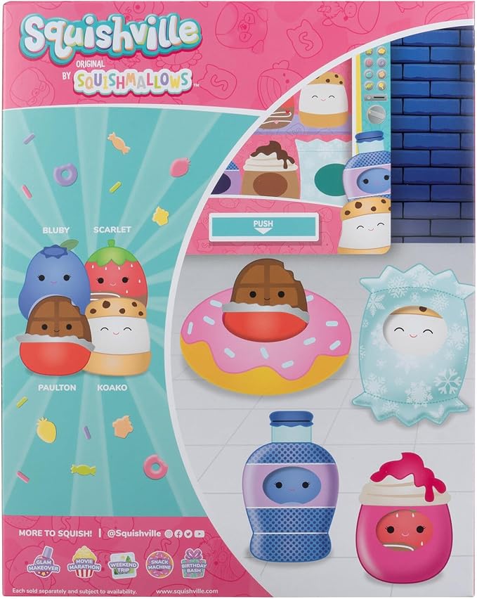 Squishville by Original Squishmallows Snack Machine Accessory Pack - Four 2-inch Squishmallows Plush Including Bluby, Kaoko, Scarlett, and Paulton and Four Plush Costumes - Toys for Kids