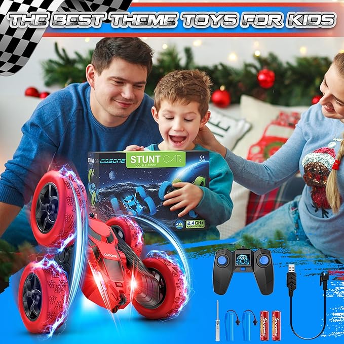 Remote Control Car for Boys - Car Toy for Kids Age 6 7 8 9, 4WD 2.4Ghz Double Sided 360° Rotating RC Cars with Headlights, Christmas Birthday for Boys and Girls - Red