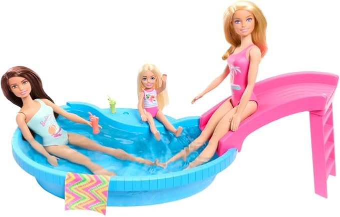 Barbie Doll & Pool Playset, Blonde in Tropical Pink One-Piece Swimsuit with Pool, Slide, Towel & Drink Accessories