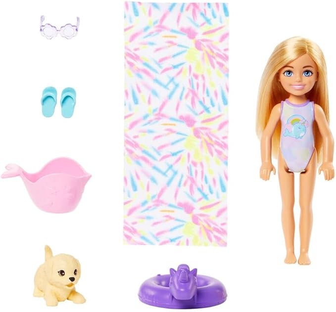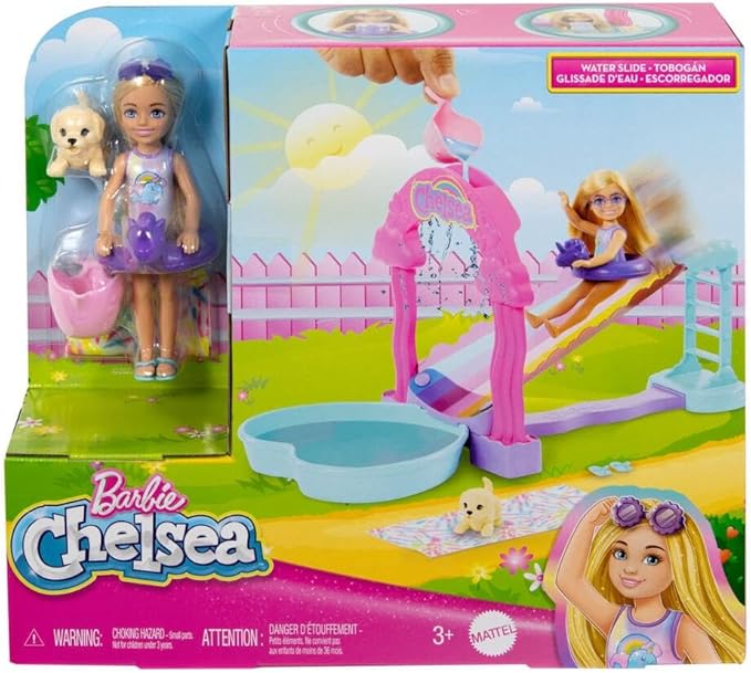 Barbie HTK39 Rainbow Water Slide Set with Chelsea Doll and Puppy, Height 20 cm, Accessories Included, Children's Toy, from 3 Years,