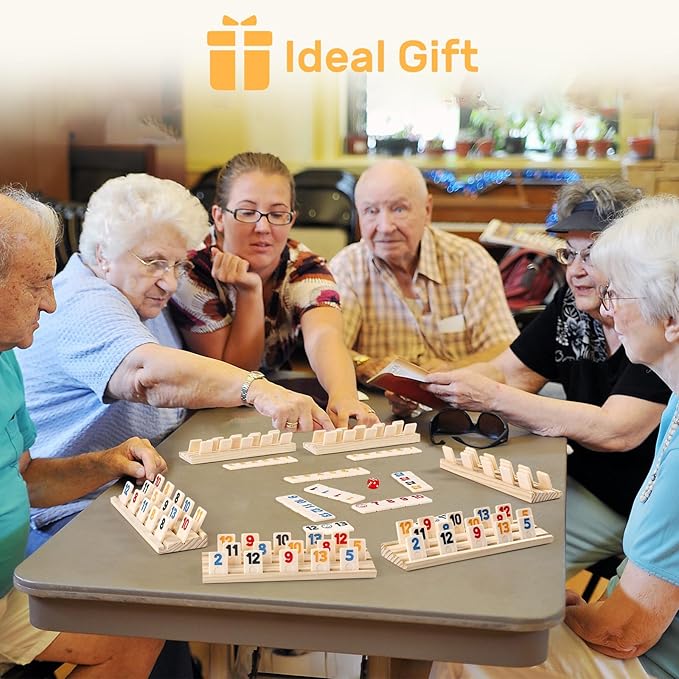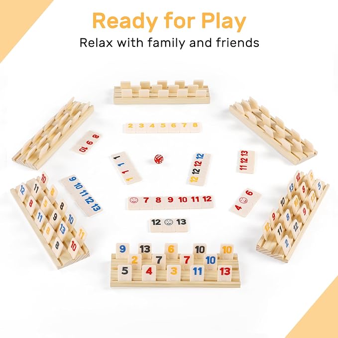 Rummy Cube 6 Player Edition with 6 Wooden Racks/Trays, 160 Large Numbers Rummy Tiles Set with Zippered Case, Rummy Travel Game Set with 6 Tiles Holders - Classic Board Games for Family Adults Kids