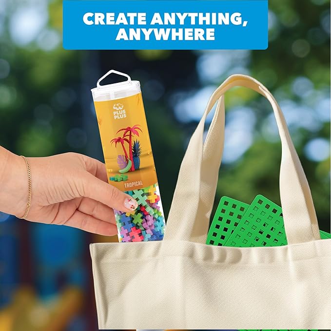 PLUS PLUS 240 Piece Interlocking Building Blocks for Kids, Open Ended Connecting Toys, STEM Bin Mini Manipulatives - Tropical Mix Play Tube & Baseplate