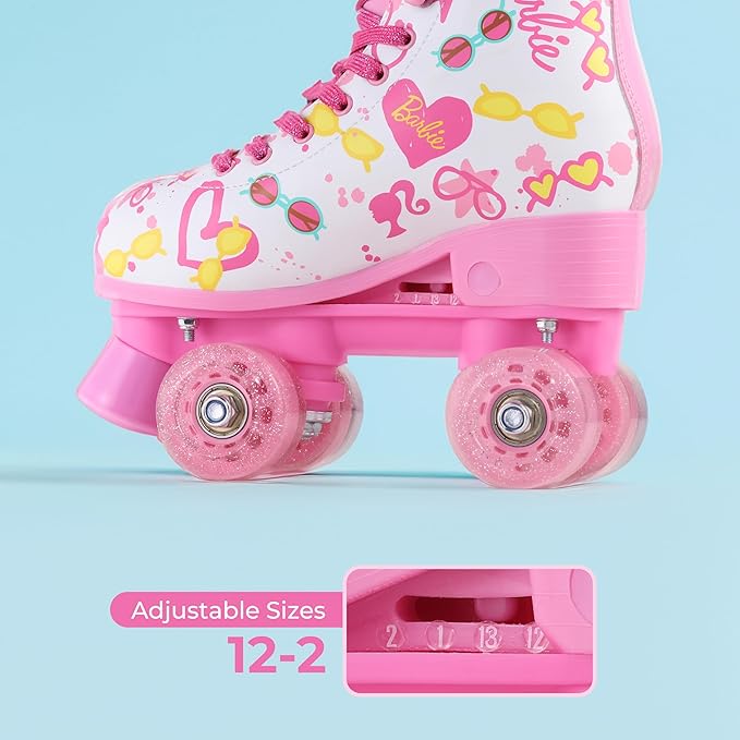 BARBIE Roller Skates for Girls - Adjustable Sizes 12-2, Glitter Wheels, ABEC 5 Bearings - Durable PVC Material, Foam Shoe Lining - Perfect for Active Fun and Adventures