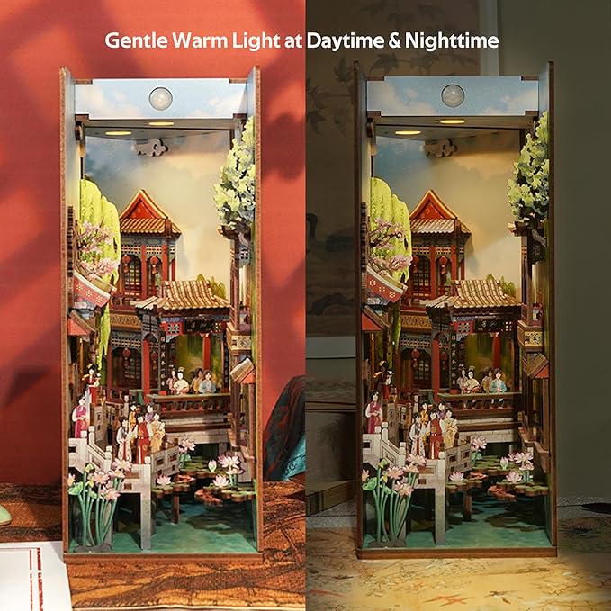 Tonecheer DIY Book Nook Kit for Adults, Wooden 3D Puzzle Bookend Bookshelf Insert Decor, Chinese Booknook Miniature House Kit with Dust Cover and Body Motion Sensor LED Light (Dream of Red Mansions)