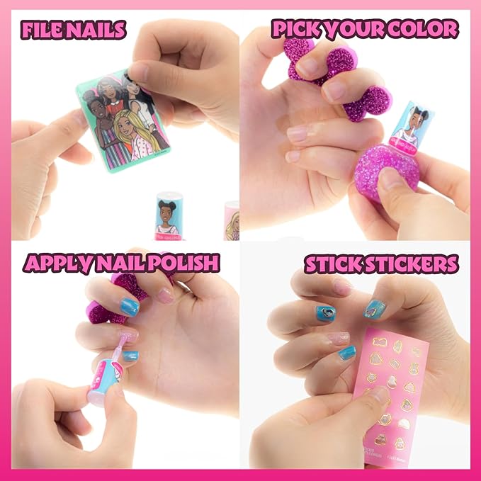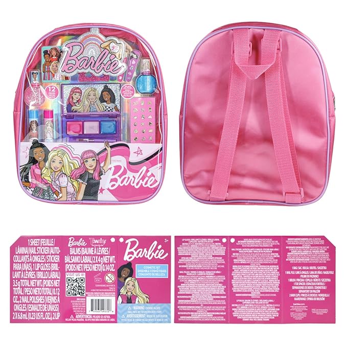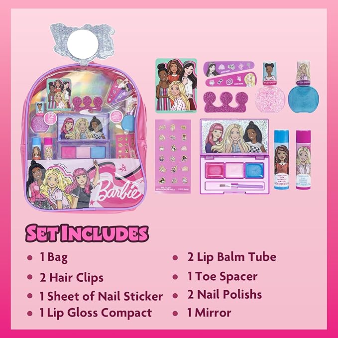 Barbie Makeup Filled Backpack Set, Including Lip Balm, Nail Polish, Nail File, Hair Bows, and Other Accessories, Ages 3+ for Parties, Sleepovers and Makeovers, by Townley Girl