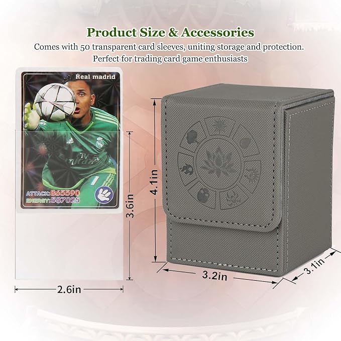 Arkeiliy MTG Deck Box with 50 Pcs Card Sleeve, 110+ Card Storage Leather Deck Box for Magic Commander, Collectible Trading Card Cases for Trading Card Games (Grey)