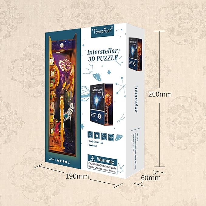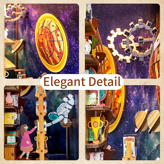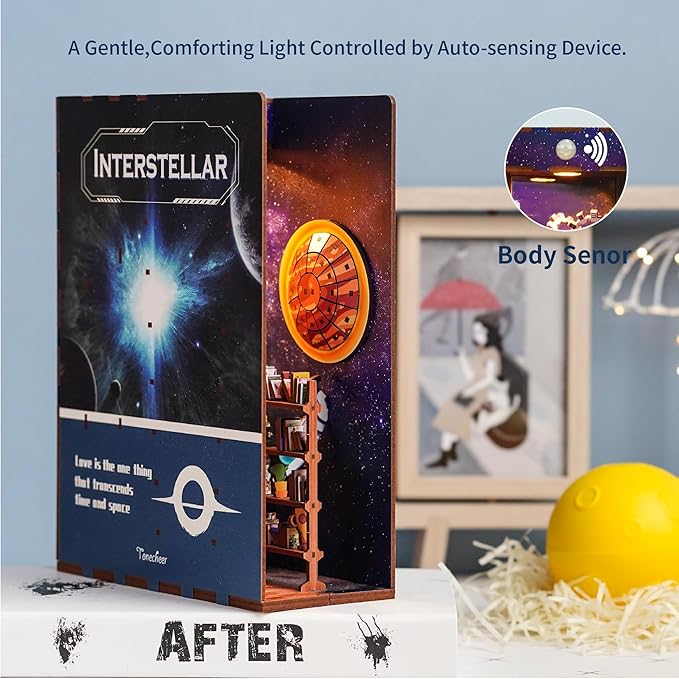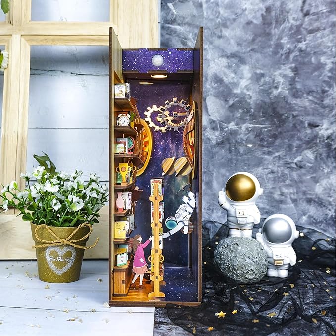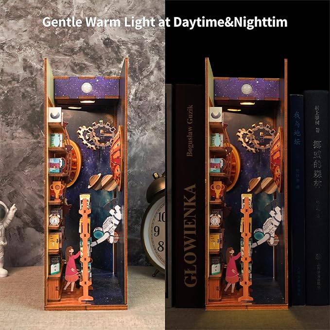 Tonecheer DIY Book Nook Kit for Adults,3D Wooden Puzzle Bookend Bookshelf Insert Library Decor, Booknook Miniature House Kit with Body Motion Sensor LED Light(Interstellar)