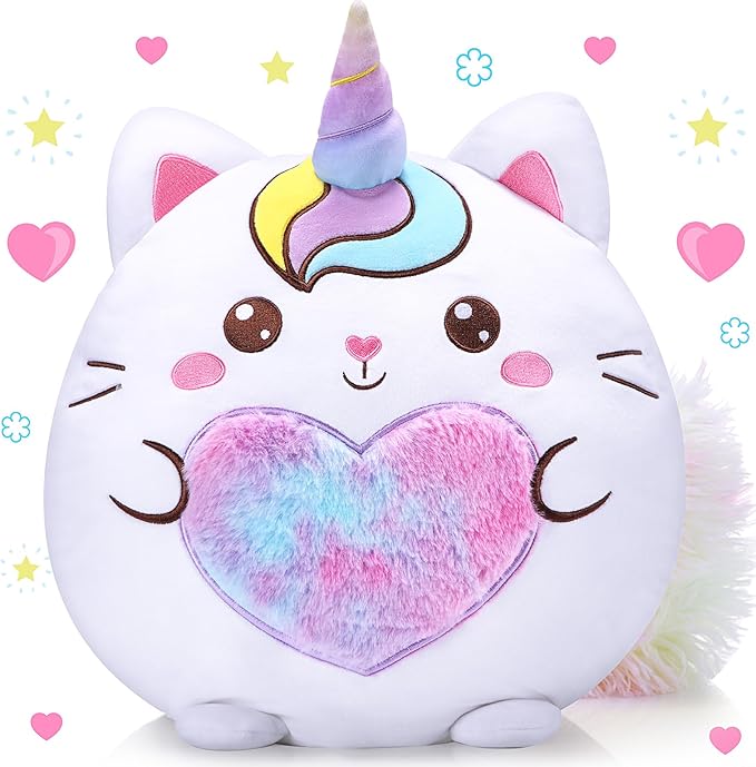 Leyndo Stuffed Unicorn Pillow Plush 14 Inch Cat Plush Toy Unicorn Cat Stuffed Animal Birthday Kitty Plushies Pillow for Christmas Birthday Kids Toddlers Girls Boys Room Sofa Car Decor(Cute)
