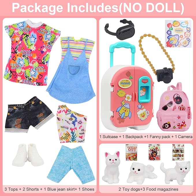 UNICORN ELEMENT 16 Pcs Doll Clothes and Accessories for 11.5 Inch Girl Dolls, Fashion Travel Suitcase Set Including Blue Jean Skirts, Bags, Food Magazines etc (Style B)