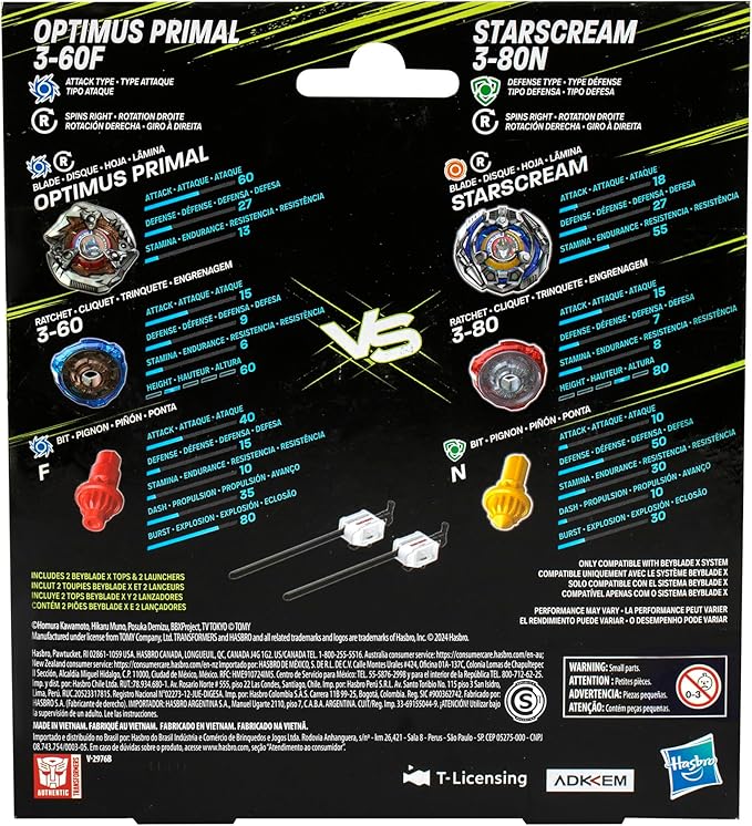 Beyblade X Transformers Collab Optimus Primal 3-60F vs. Starscream 3-80N Multipack Set with 2 Tops & 2 launchers; Battling Top Toys for 8 Year Old Boys & Girls (Amazon Exclusive)