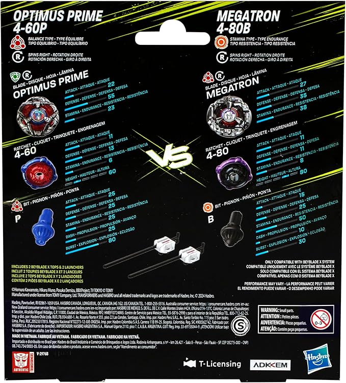 Beyblade X Transformers Collab Optimus Prime 4-60P vs. Megatron 4-80B Multipack Set with 2 Tops & 2 launchers; Battling Top Toys for 8 Year Old Boys & Girls (Amazon Exclusive)
