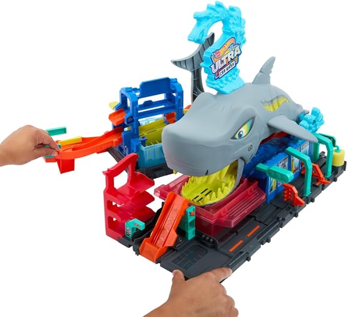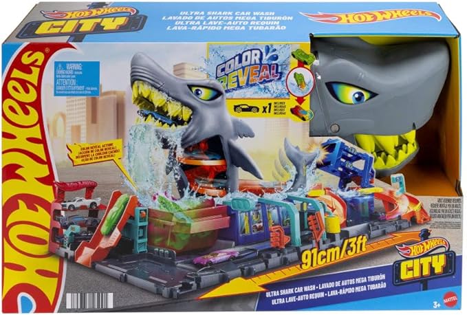 Hot Wheels City Track Set, Ultra Shark Car Wash with 1:64 Scale Color Reveal Toy Vehicle, Repeat Color-Change Feature, Storage