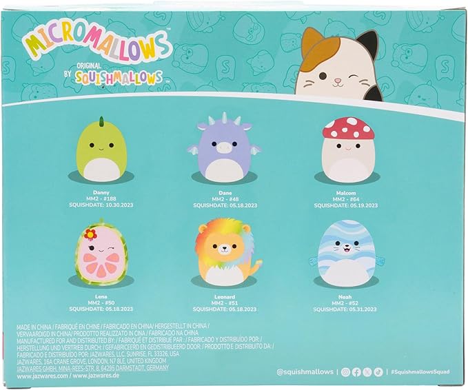 Squishmallows Original Micromallows 6-Pack – Danny Dinosaur, Dane Dragon, Malcolm Mushroom, Lena Guava Fruit, Leonard Lion, Noah Seal