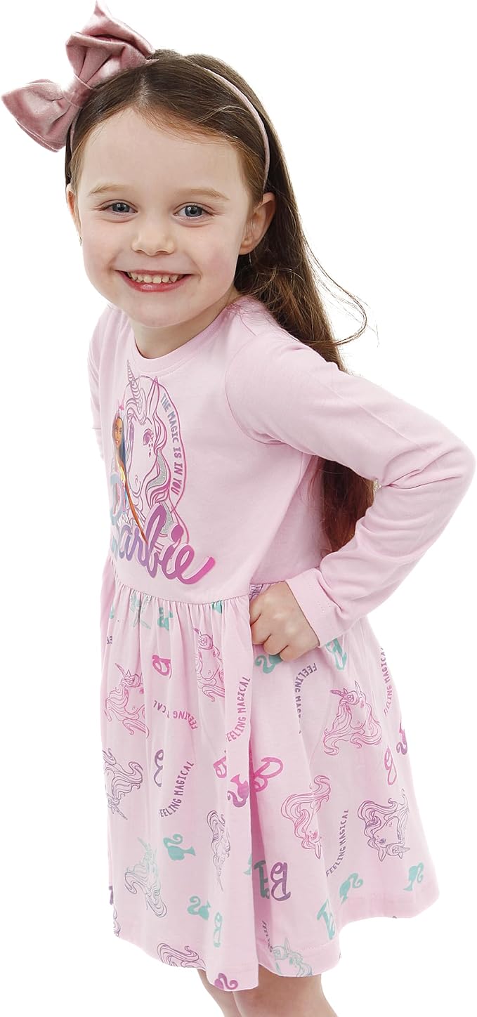 • Fashionable & Fun Girls Sparkly Dress: Adorned with a playful pattern featuring the Barbie logo, a unicorn, and the phrase 'feeling magic,’ this pink dress for kids combines whimsy and style, enhancing your little girl's Barbie clothing collection