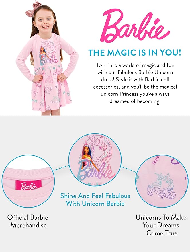 About This Exclusive Barbie Unicorn Dress: This girls' dress is a magical canvas, showcasing a beautiful turquoise and pink line... Read more