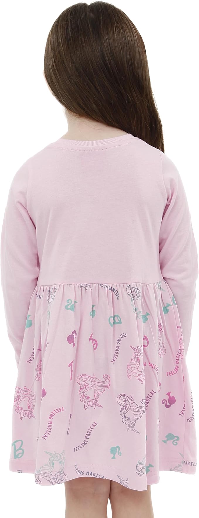 • Fashionable & Fun Girls Sparkly Dress: Adorned with a playful pattern featuring the Barbie logo, a unicorn, and the phrase 'feeling magic,’ this pink dress for kids combines whimsy and style, enhancing your little girl's Barbie clothing collection