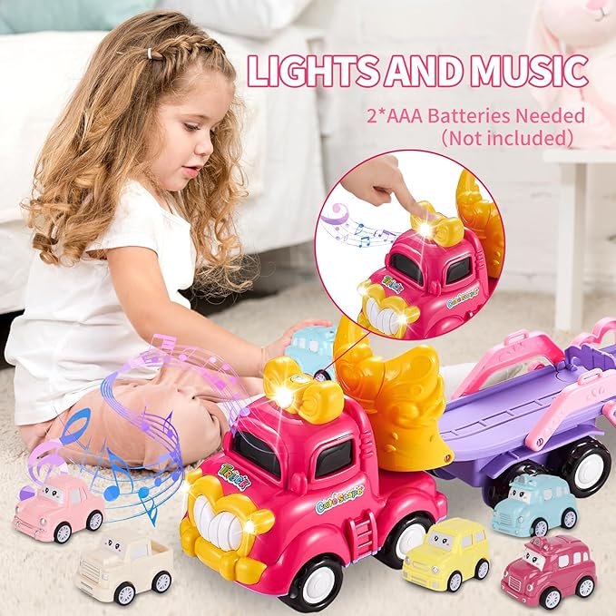 Toddler Girls Cars for 1 2 3 4 5 Year Old,7-in-1 Pink Princess Foldable Transport Carrier Trucks with Lights and Music,Birthday Presents for 1-3 3-5 Yrs Old Babys