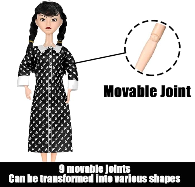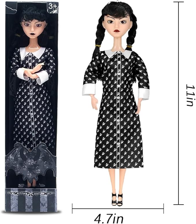 11.5'' Addams Doll, Black Dress, High Heels, and Hair, Christmas Decoration Perfect ChristmasToy Gift for Girls & Fans(H)