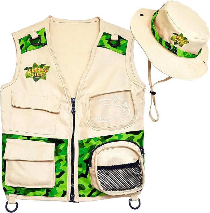 Safari Kidz Outdoor Explorer Kit - Green Camouflage Cargo Vest and Hat Set, Backyard Nature Adventures, Washable Costume, Age 3+