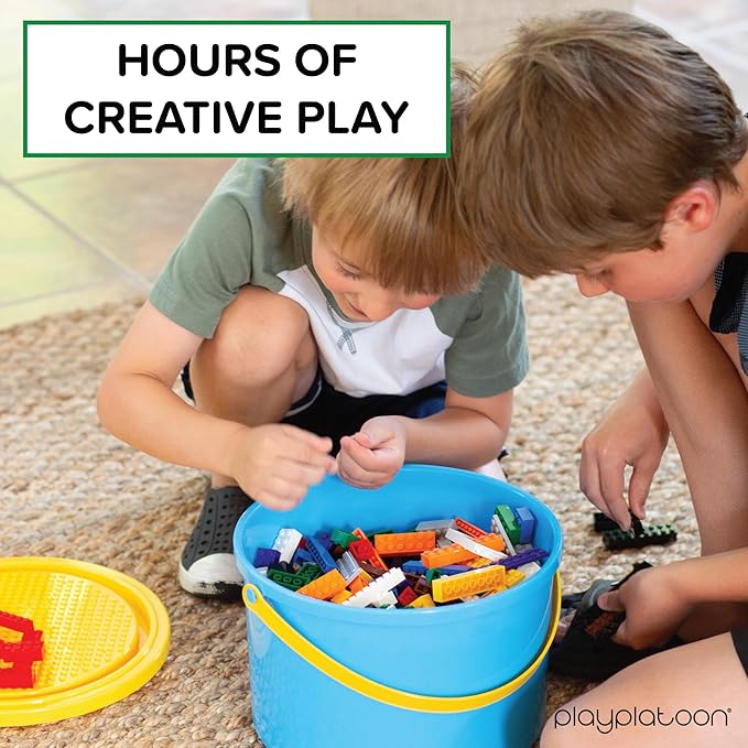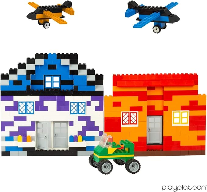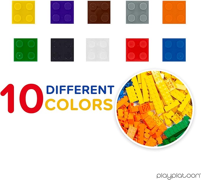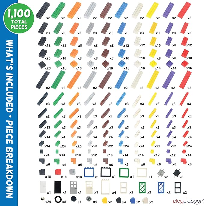 Play Platoon 1100 Pieces Building Bricks Set - 10 Classic Color Blocks - Bulk Building Blocks Compatible with Major Brands, 14 Different Shape Bricks - Includes Wheels, Tires, Axles, Windows & Door
