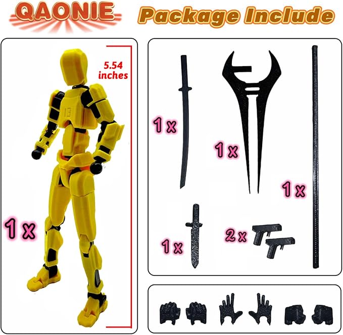 3D Printed 5.54-inch Multi-Jointed Action Figures Dummy13, Full Body Mechanical Movable Toy, Multiple Accessories, Hand Painted Figure, Desk Decoration, Creative Gifts (Bright Yellow)