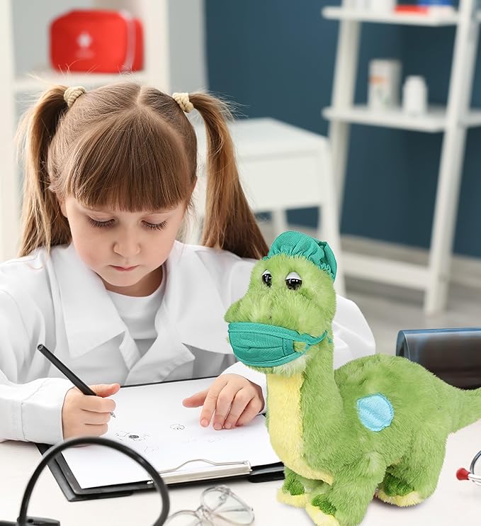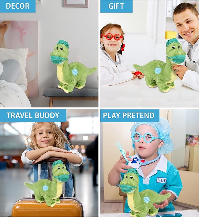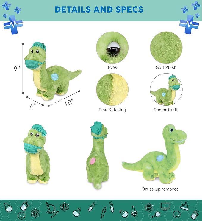 DolliBu Green Dinosaur Doctor Plush Toy - Super Soft Dinosaur Doctor Stuffed Animal Dress Up with Cute Face Mask and Cap Outfit - Gift for Doctor, Nurse, Surgeon - 10 Inch