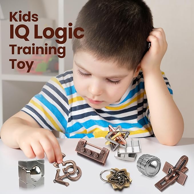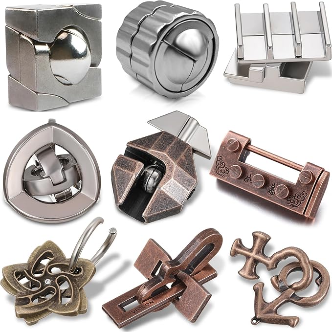 Wettarn 9 Pcs Metal Brain Teaser Puzzles Teaser 3D Steel Puzzle for Adults Unlock Interlocking Games IQ Education Smart Logic Test Toys for Adults Mind Challenge(Educational Style)