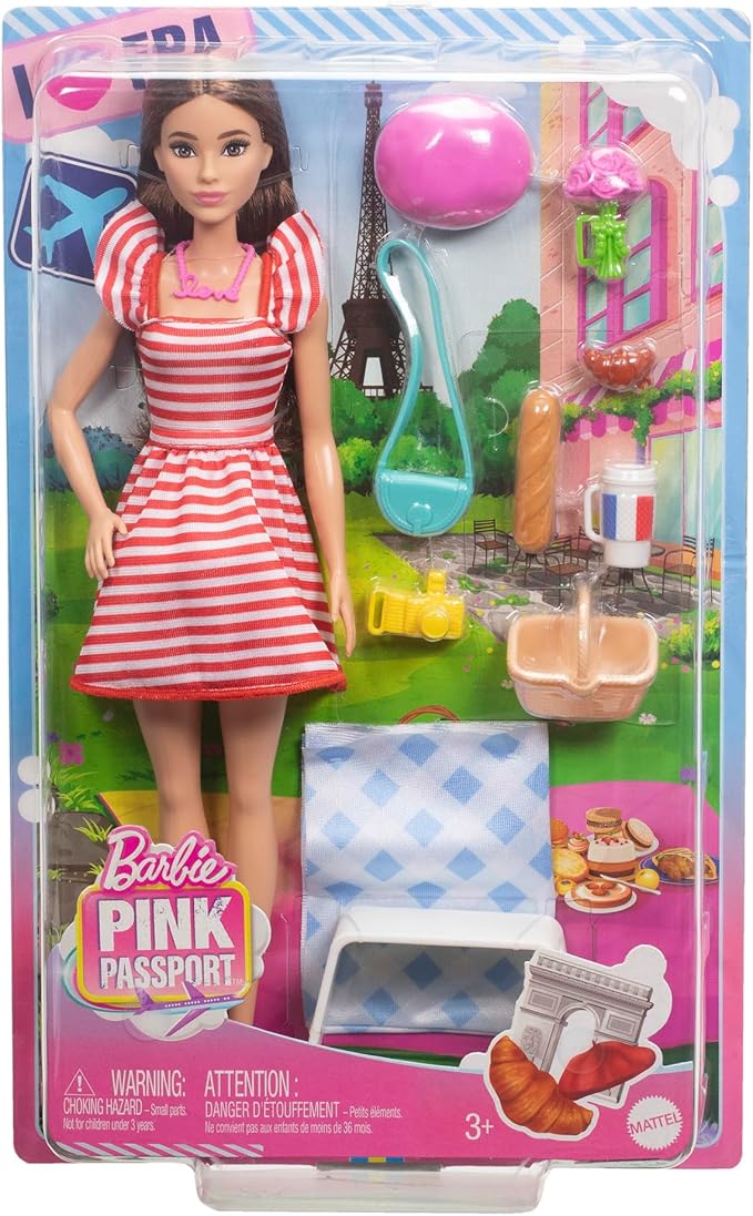 Barbie Pink Passport Paris Doll Set With Clothes & Picnic Accessories, Includes Brunette Doll