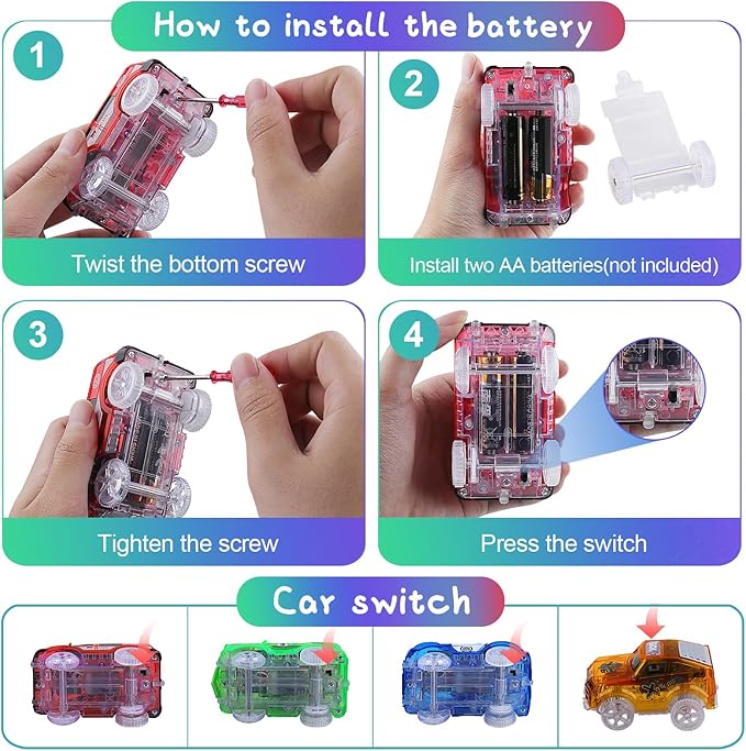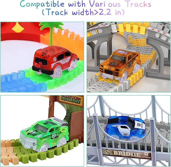 Tracks Cars Magic Light Up Track Cars Toy Glow in The Dark for 3 4 5 6 7 8 Kids Boy Girl, Race Cars with 5 LED Flashing Light Battery Operated Vehicle Compatible w/Most Tracks (4Pcs)